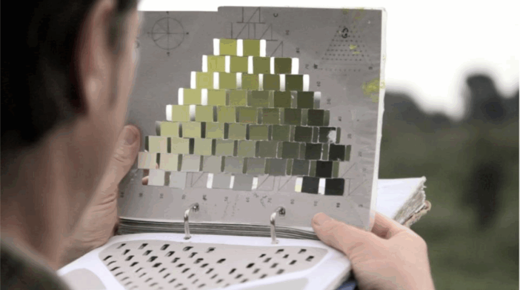 Bertolt Hering erforscht seit 2003 die Farben der Landschaft in ihrem jahreszeitlichen Wandel. Zur Farbbestimmung vor Ort werden Farbmuster eines international verbreiteten Farbsystems eingesetzt.