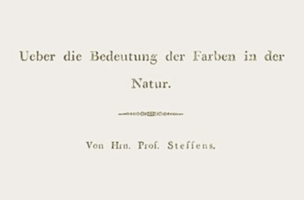 Ein älterer Text, der sich mit diesem Thema auseinandersetzt, ist Henrik Steffens: „Über die Bedeutung der Farben in der Natur“. Er erschien 1810 als Vorwort zur „Farbenkugel“ von Philipp Otto Runge. Da die meisten modernen Ausgaben von Runges „Farbenkugel“ diese Abhandlung nicht mehr enthalten, habe ich mich 2008 entschlossen, die Seiten 29 bis 60 von Runges Farbenkugel erstmals online zur Verfügung zu stellen.